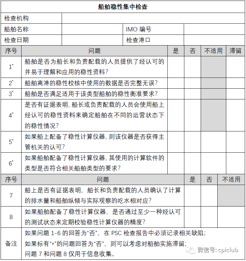 根据集中检查的联合声明,港口国监督检查官将使用预先准备好的问卷表来评估船上提供的信息和配备的设备是否符合相关公约的要求,船长和驾驶员是否熟悉与船舶稳性相关的操作,以及相关设备是否得到适当维护和运行。