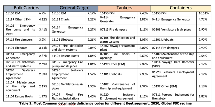 每类船舶可滞留缺陷代码(前十位)多少有相同的部分。所以,若船舶在准备工作中针对这些缺陷项,那么可以避免滞留情况发生。但是,也不排除港口国监督官员会检查其他安全区域/问题,对可滞留项使用不同的代码。