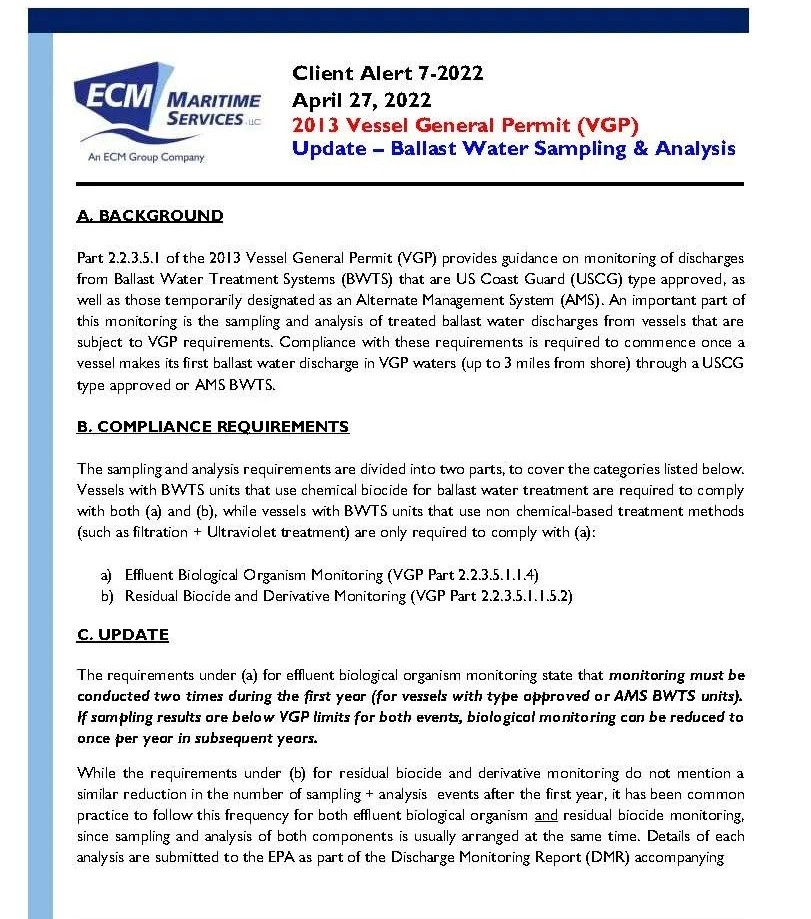 第七,USCG认可的Ballast Water Treatment Systems (BWTS)和Alternate Management System (AMS),如果采用的是物理法处理方式的设备,需要每年进行两次的non chemical-based treatment methods分析测试,这个问题已经有很多船舶被罚款了。