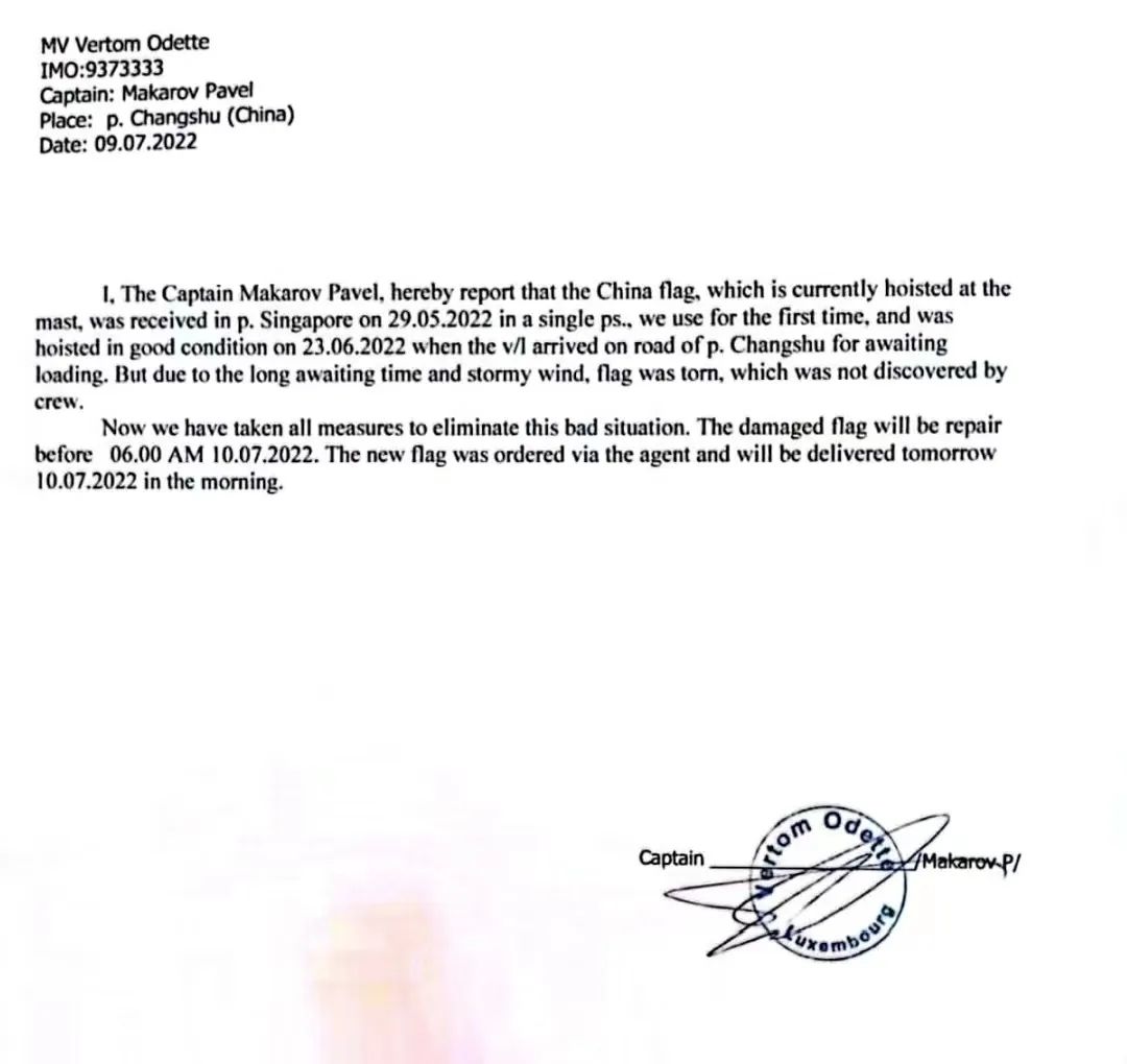 7月9日,常熟海事局水上交通管理中心在依法对码头国际航行船舶实施电子巡航中发现,靠泊在新泰码头的卢森堡籍杂货船“VERTOM XXX”轮悬挂的中国国旗严重破损,船上10名船员均为外国籍船员,其行为违反了《中华人民共和国国旗法》《中华人民共和国内河交通安全管理条例》《船舶升挂国旗管理办法》相关规定。