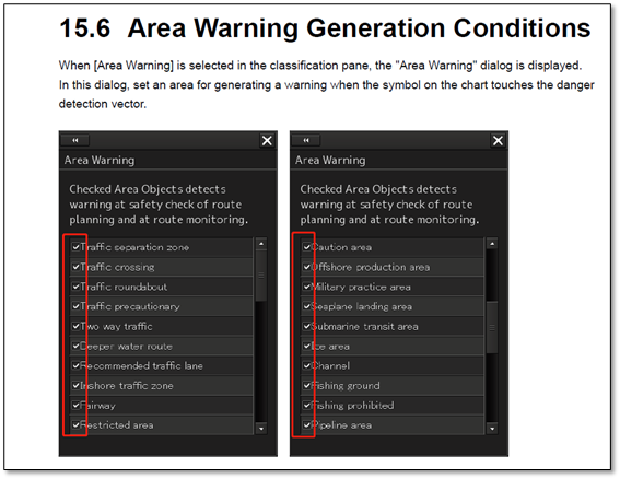 点击 [Menu] -[Alert] -[Area Warning]进入选择或剔除海图报警对象。