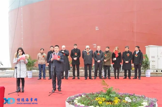 上午11:30,7#20.8万吨散货船(TC0405)命名仪式隆重举行,公司总经理郭朝义、常务副总经理蔡爱国、副总经理杨炯烽、总经理助理张涛及船东船检代表出席仪式。教母佛罗伦萨•兰格女士命名该船为“HEDWIG OLDENDORFF”,并揭幕、敲香槟祝福。下午3:08,该船顺利签字交付。