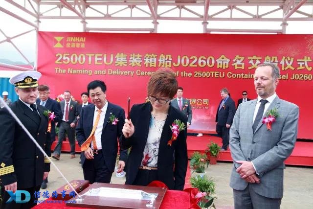 5月30日上午,金海智造向法国达飞集团交付第2艘2500TEU集装箱船“CMA CGM NEVA”号,中信保公司曾莹女士作为教母命名、砍缆。法国达飞集团执行副总裁Gerard、上海办事处总经理马森,现场建造组经理Oleg,DNV·GL船级社舟山区经理John,“CMA CGM NEVA”号船长Andrei,金海智造董事长张天弋、副董事长李国锋、副董事长兼总裁杨猛等出席仪式。