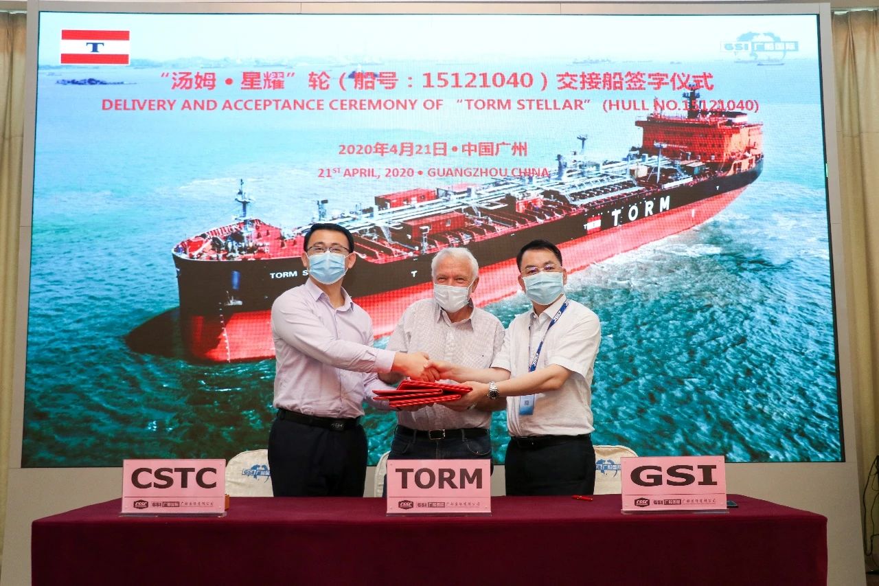 4月21日,中国船舶集团旗下广船国际有限公司为TORM航运公司建造的5万吨成品油/化学品船7号船“汤姆·星耀”号船签字交付。这是广船国际复工复产以来交付的第3艘船。