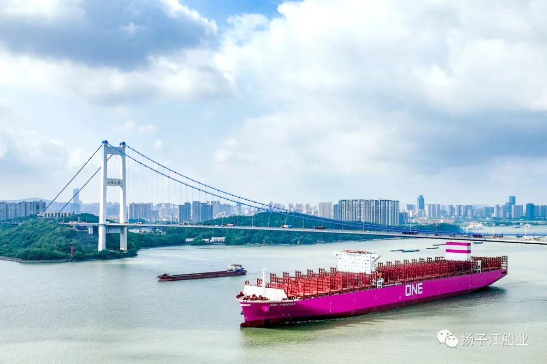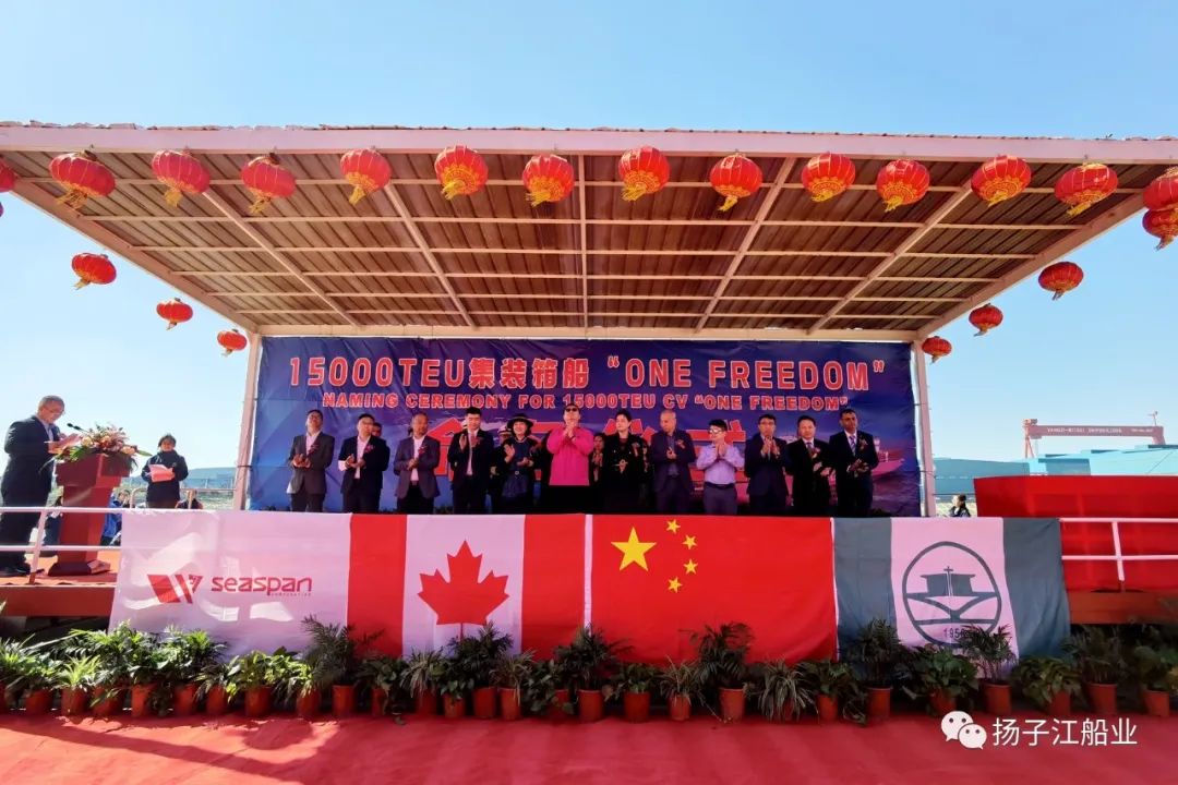 10月12日中午,江苏扬子江船业集团新扬子造船为SEASPAN船东建造的首制15000TEU集装箱船“ONE FREEDOM”轮交付离厂,开启首航。