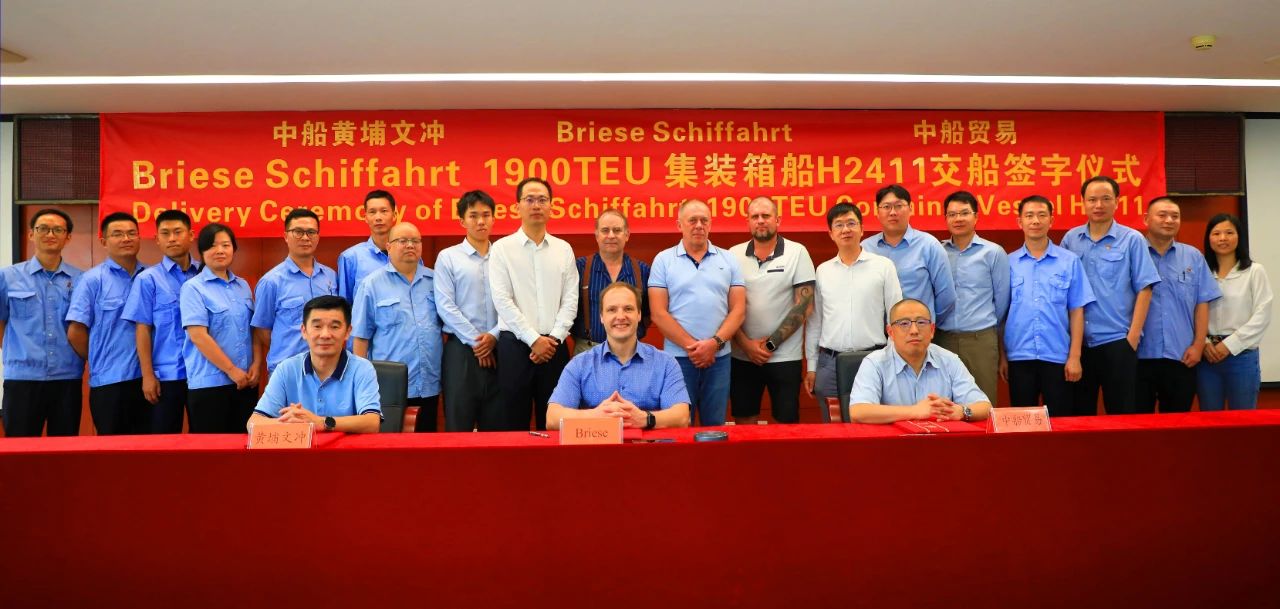 10月30日下午,德国BRIESE公司代表、中船贸易代表和黄埔文冲公司代表在各方来宾的见证下,签署了交船文件。H2411船于10月12日上午完成所有试航项目,在试航后18天即顺利交付,较合同交船时间提前了92天。