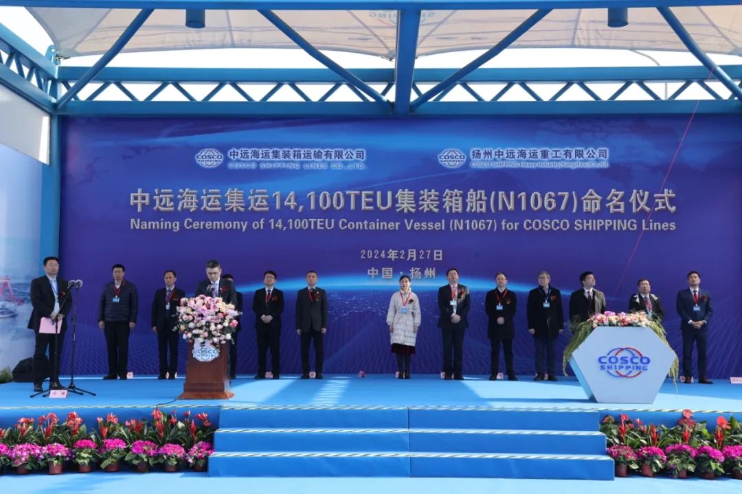 2月27日上午,扬州中远海运重工承建中远海运集运的第三艘14100TEU集装箱船(N1067)在扬州顺利命名。