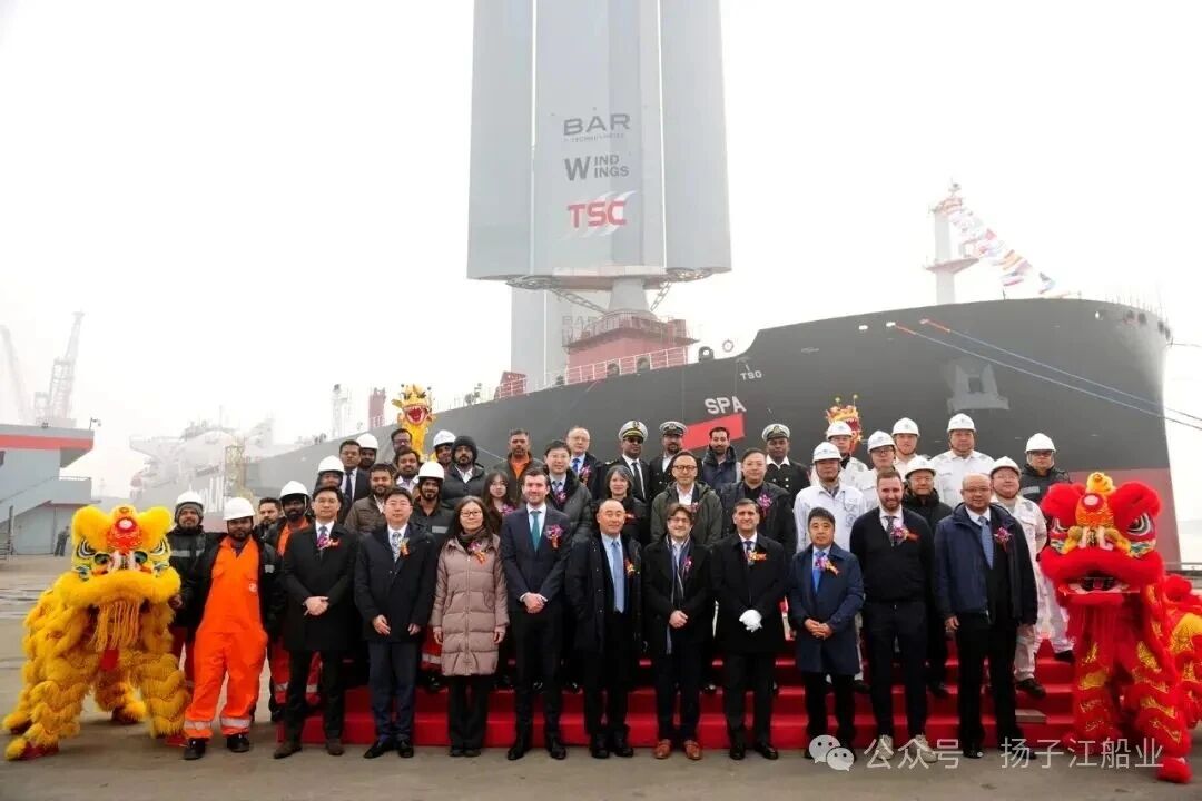 1月9日上午,由扬子江船业集团旗下新扬子造船为英国 Union Maritime Limited(UML)量身打造的全球首制114,000DWT风力辅助推进LNG双燃料油轮“SPA”轮驶离船厂码头,交付投入运营。此前,双方已于1月6日举行命名仪式并完成交船文件签署。