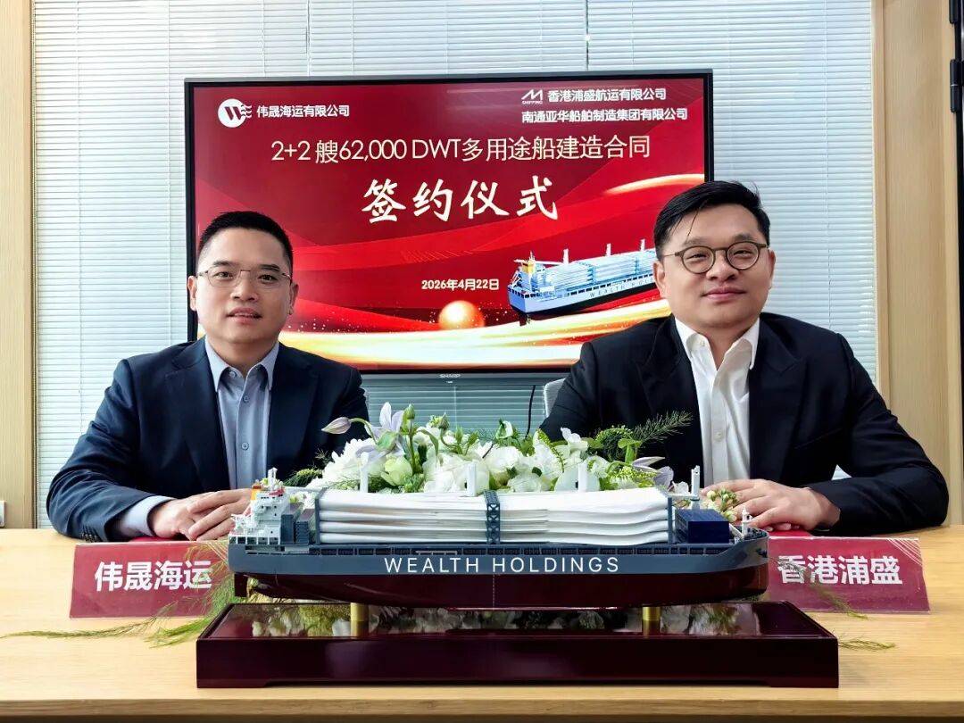 信德海事网最新获悉,伟晟控股旗下伟晟海运有限公司、香港浦盛航运有限公司与南通亚华船舶制造集团有限公司正式签署了2+2艘62,000载重吨多用途船建造合同,签约时间为2026年4月22日。