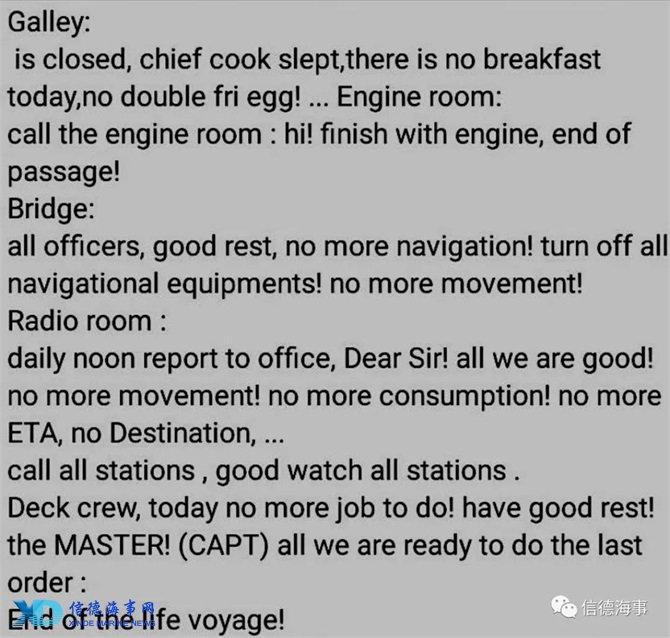 发报员:Sir,我们现在很好,今天船没有移动,也没有油耗,淡水也没有消耗,ETA我也不知道是多久,Destination我们也到不了了。