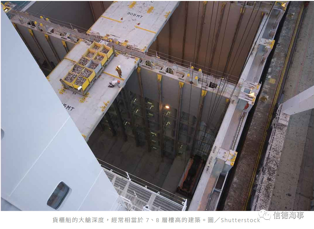 廖秉均补充,一般货柜船舱盖上的堆栈、也就是我们看得到的货柜,其实大约只有总货柜量的三分之一,余下的都放在舱盖下的「大舱」(cargo hold),就是为了让船舶重心降低。