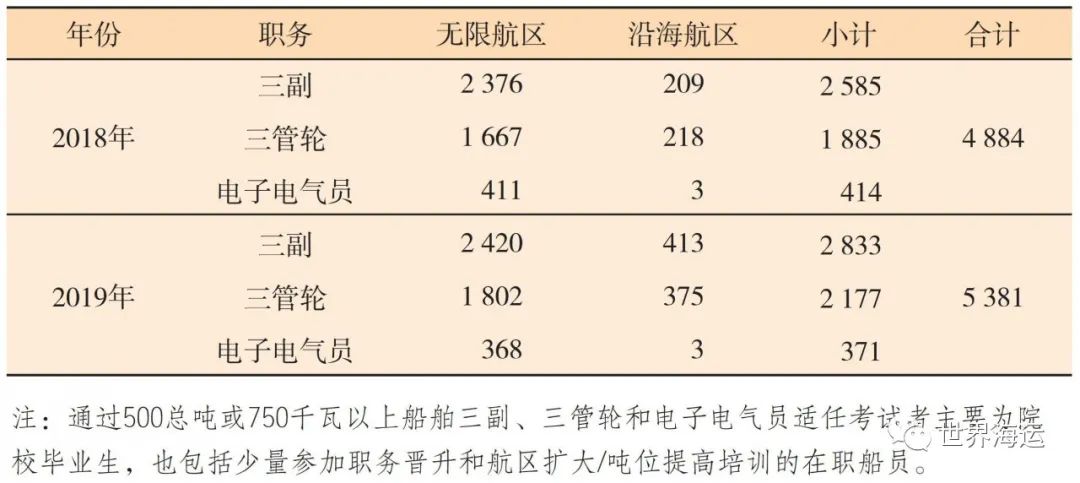 2018年和2019年的船员发展报告统计了当年通过各等级船员适任考试的情况 ( 2017年以前的报告只统计了参加适任考试的人次 ),本文整理了近两年通过三副、三管轮和电子电气员适任考试的人数,见表5。对比近年全国航海院校招生数量和近两年通过操作级海员适任考试的人数可以发现,全国航海院校的毕业生每年仅有约三分之一通过操作级适任考试。