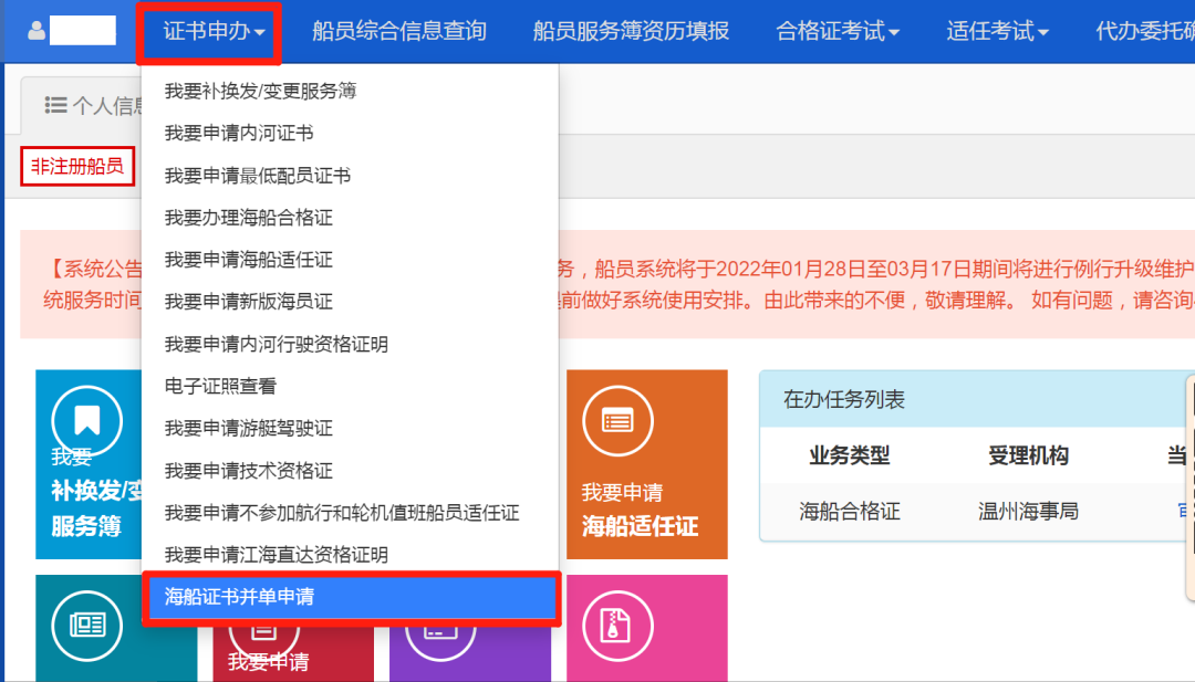 点击“证书申办”——点击“海船证书并单申请”