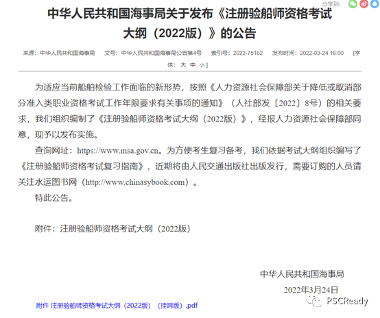 中国海事局发布了正式版本的《注册验船师考试大纲(2022)》。