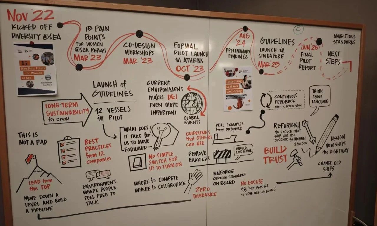在对来自 23 个不同国籍的 115 名女海员进行采访后,All Aboard Alliance于 2023 年10月启动了Diversity@Sea试点项目,以解决对话中发现的痛点。在为期10个月的试点项目中,12家先行航运公司测试了几种共同设计的解决方案,12艘试点船上的约400名海员每天提供反馈,以评估这些措施的影响。