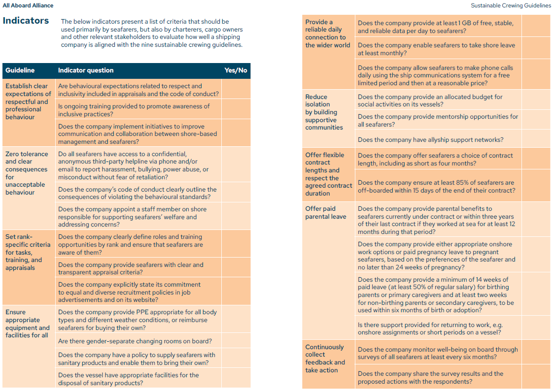 各参与公司的试点负责人密切合作,将海员的经验转化为九项可持续船员指南。每项指南都包括关键指标,以帮助海员、租船人、货主和航运公司评估航运公司或船舶与每项指南的一致性程度: