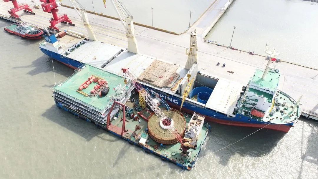 4月26日,江苏太仓码头。在经过一系列定制化的操作后,特运“大三”系列重吊船“大泰”轮承载重达2400吨、约43公里长的海底电缆整装待发,将启航前往欧洲。