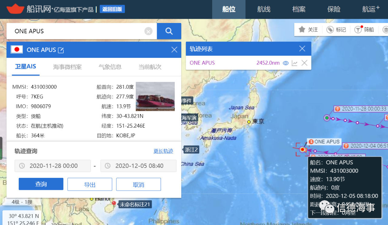 船讯网为信德海事网提供的该轮的最新轨迹信息显示,目前该轮的确正在以13.9节左右的速度往回,前往日本神户港航行。
