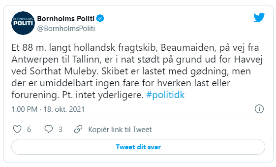 10月18日,一艘荷兰籍散货船满载化肥,在从比利时安特卫普前往爱沙尼亚塔林的途中,在Havvej附近离海岸300米的水域,以13节的航速,径直地撞上了海岸,搁浅了。