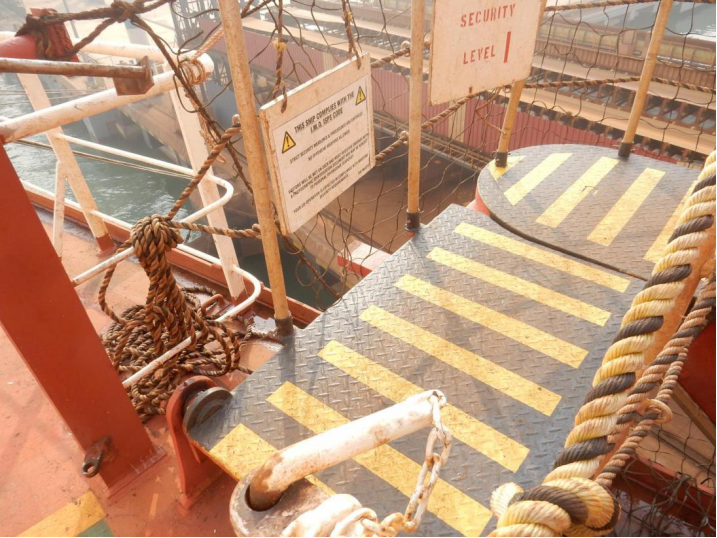 (2)舷梯落岸下踏板应避开障碍物,安放平稳,严禁扭曲。吊梁、链条要注意绞高或安放妥当,以免碰头和妨碍上下船。