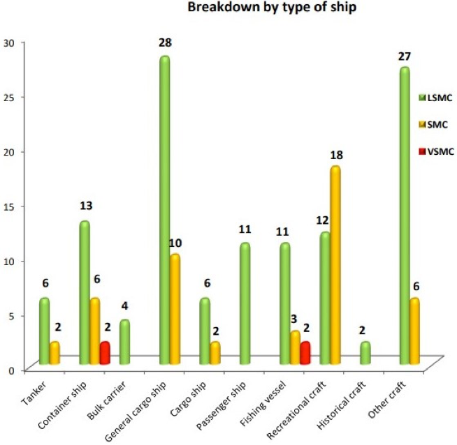 按照船舶类型来看,散货船再次“领先”,紧随其后的是集装箱运输船和商业用途游船,客船和渔船并列。“其他”分类中,包括未被提及的拖船、引航船、海工支持船等。