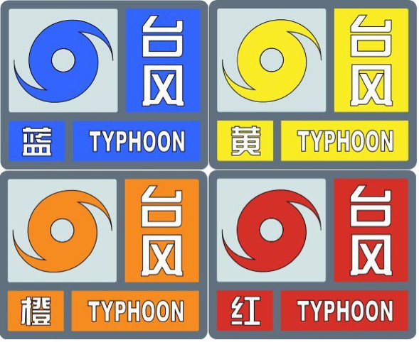 为了规范气象灾害预警发布工作,防御和减轻气象灾害,保护国家和人民生命财产安全,中国气象局、中央气象台在2010年4月发布新的《中央气象台气象灾害预警发布办法》,将台风预警信号分为红色预警、橙色预警、黄色预警、蓝色预警,其标识如下图所示。