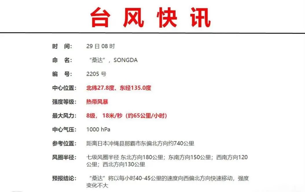 今年5号台风(热带风暴)“桑达”于7月29日0800时在北纬27.8°东经 135°,即距宁波1250公里的海面上,中心最大风力 8级,中心气压为1000百帕,移动方向西西北,移动速度每小时44公里。