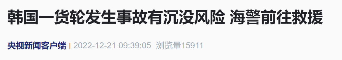 据韩联社等多家韩国媒体援引韩国海警消息报道,当地时间21日8时53分左右,韩国海警部门接到报警求救信息称,在全罗北道群山市于青岛附近海域,一艘货船发生事故正在沉没。接到报警后,韩国海警随即出动救援力量前往事发海域。