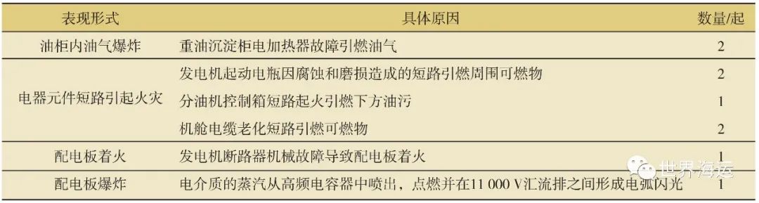 电器设备故障引起机舱火灾共计9起,其表现形式包括:①电加热器控制失灵引燃油气,共计2起;②电器元件短路引燃可燃物,共计5起;③电器元件过载引燃可燃物,共计2起。电器设备故障引起火灾具体情况见表4。