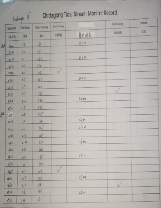 A 锚地潮高潮时与潮汐表中4511 Khal No.18(22-13N 091-48E)基本一致,A锚地的高低潮潮时比减载锚地晚大概2-3H。引水会提前邮件告知登船时间,差不多是在Kutubdia Island高潮前1H左右,以满足接近高潮时有足够水深过浅。本次航程大概22海里,最浅水深9米,无助航标志,需要穿越C锚地和B锚地。抵达C锚地下边缘时需要CH12频道报告PROT CONTROL进入C锚地计划到A锚地抛锚,出C锚地进出B锚地不需要报告。引水上船后车钟逐步推至FULL AHEAD,UKC维持在1.5米以上,当UKC降至1米左右时,车钟降至HALF AHEAD,最小UKC是0.8米。在锚地穿插时,速度维持在9节以上,要与锚泊船船头保持足够距离防止强风流引起紧张局面,还要注意锚地穿行的驳船、小渔船和渔网等,备双锚,船头专人瞭头协助。提前选好锚位和应急锚位,抵达锚位前判断好风流方向。本次我轮最涨潮前抵达A锚地,航速8节,在锚地掉头后顶流抛锚,掉头顶流后船速会很快降下来。我轮锚位:22-15.469N 091-42.700E,水深11.4米,最近两天最低潮高1.8米,10节入水,与周围船保持在0.7海里左右距离。A锚地涨潮时船首向160度,落潮时首向340度左右。抛锚前确保在160方向和340方向上安全距离内没有其他船锚泊,万一本船或他船走锚时能留有较大的余量。A锚地东侧靠近岸边相对流急,西侧流速较缓,本次我们选的锚位在A锚地西南角边线上,抛锚期间最大流速4.3节。内锚地小渔船比较多,基本上都是船上救生艇改造的,也会在船周围放网。锚泊期间不但要防止本船走锚,还要监控周围船舶动态,防止因它船走锚失控引起擦碰。