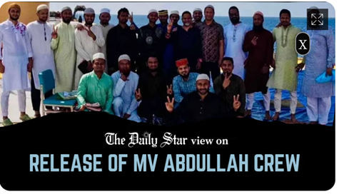 孟加拉国外交部长Mohammad Hasan Mahmud周日称,“在政府和有关方面的全力努力下,船员和船只在最快的时间内安全获救。该船已在一艘欧盟船只的陪同下向阿联酋航行。”