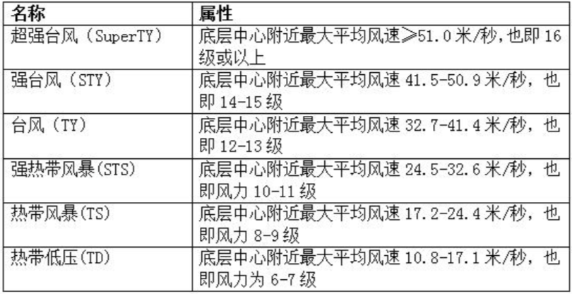 01台风等级分类不是所有的热带气旋都叫台风,只有达到一定风力(或风速)的热带气旋我们才称为台风,为便于应用和对外服务,有时把热带风暴、强热带风暴、台风、强台风和超强台风统称为“台风”下面看看台风的等级分类吧!