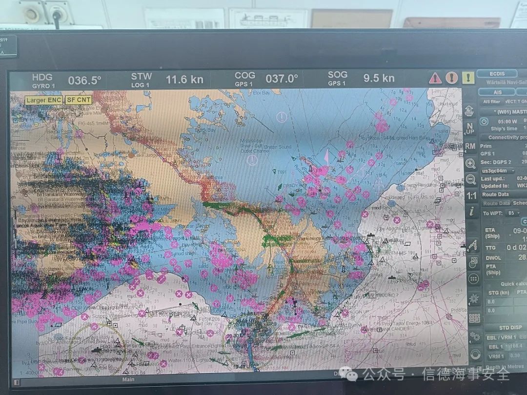 美国新奥尔良New Orleans港是墨西哥湾Gulf of Mexico内美国最大、最繁忙的港口,坐落在著名的Mississippi River密西西比河内,属于路易斯安娜州Louisiana。进出密西西比河有东南和西南两条航路,我们沿着东南航路北上航行直到在Southwest Pass Entrance Lighted Buoy处的SW Pass引水站上引水。从SW Pass引水站大约需要12小时的航程可到达新奥尔良港ETA SW Pass plus 12hrs。