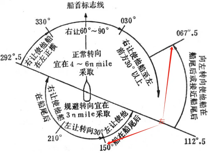 参照雷达操纵避让示意图(由英国航海协会绘制)的推荐方法,“对位于相对方位030°至330°的来船向右转向60°以上为妥”。