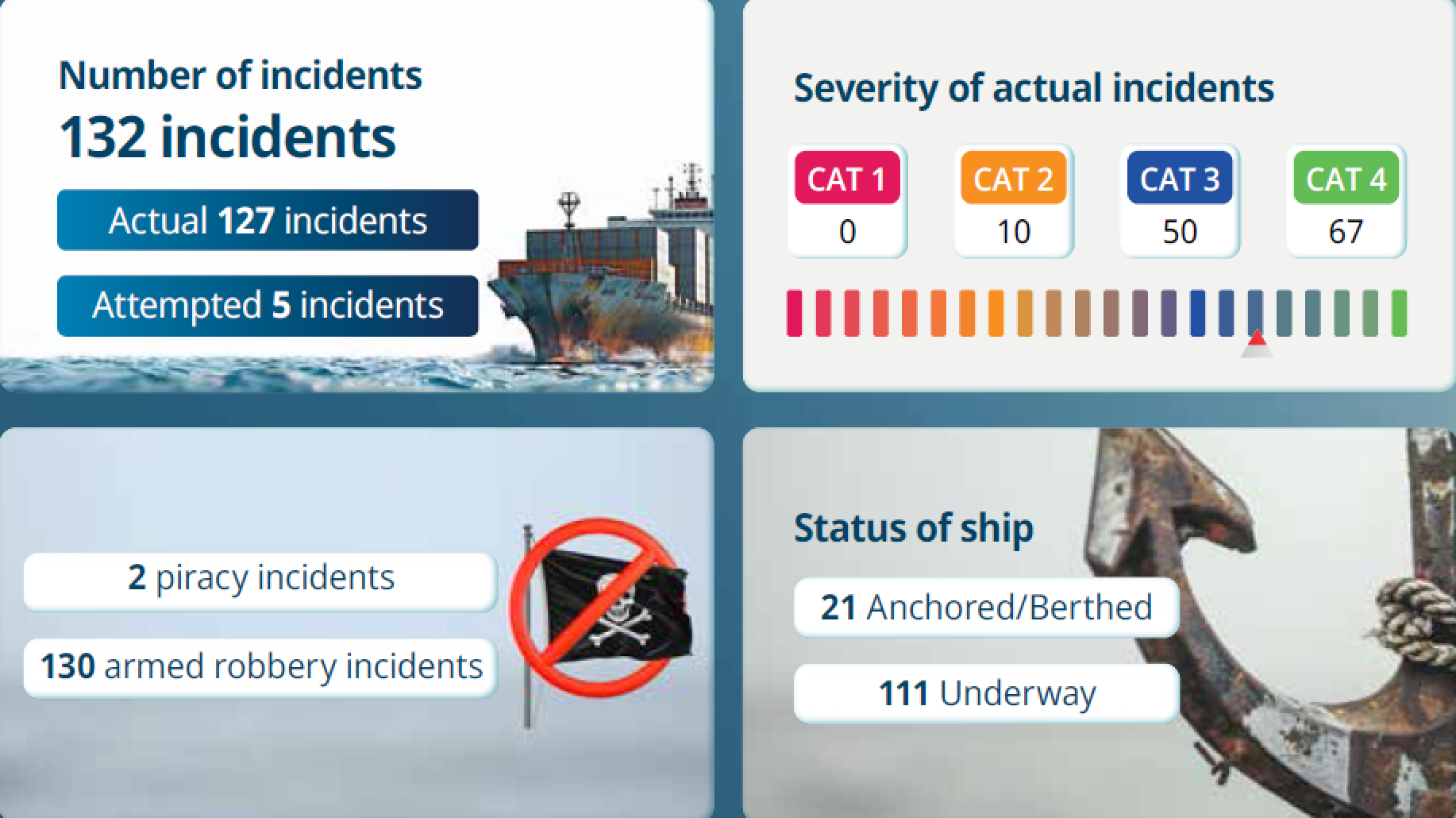 ● 总量与增长:2025年亚洲共报告132起海盗及武装抢劫船舶事件,较2024年的107起增长23%,其中实际发生127起、未遂5起。
