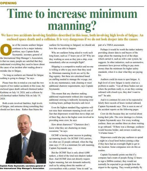 InterManager秘书长Kuba Szymanski船长在《Tanker Operator》最新一期的评论文章中,围绕两起油化船事故谈“教训与反思”:其一是化学品船“Kashima”发生的封闭处所死亡事故(2024年7月14日),其二是油/化学品船“Hafnia Nile”涉及的碰撞事故(2024年7月19日)。Kuba强调两起事故共同点非常残酷——都有死亡,也都伴随高度疲劳;而如果行业继续把责任简单归结为“某个船员犯错”,那么除了重复悲剧,“什么都不会改变”。