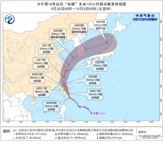 大风预报:30日08时至10月1日08时,巴士海峡、台湾海峡、台湾以东洋面、南海东北部、东海、台湾岛沿海、福建沿海、浙江沿海将有6-7级大风,其中,部分海域或地区将有8-10级大风,“米娜”中心经过的附近海域的风力有11-14级,阵风15-16级。