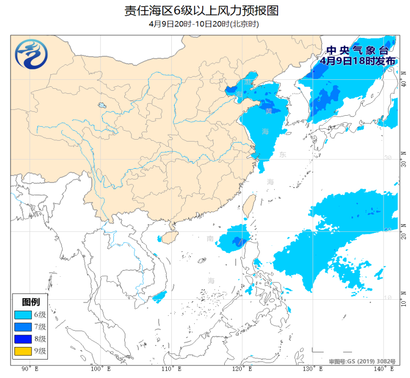 9日夜间至11日白天,渤海、渤海海峡、黄海大部海域、东海北部海域将有6~7级、阵风8级的偏南风,其中黄海北部部分海域风力可达8级、阵风9级,巴士海峡、南海东北部海域将有6~7级、阵风8级的东北到偏东风。
