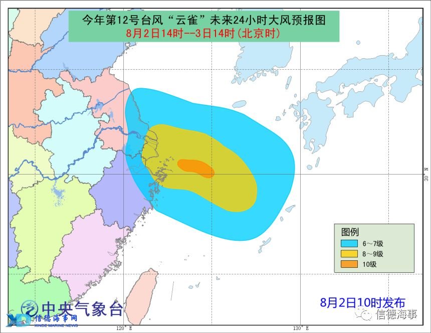 预计,8月2日午后至3日白天,东海北部海域将有6~8级、阵风9级的大风,其中“云雀”中心经过的附近海域风力可达9~10级、阵风11~12级。受大风影响海域航行、作业的船舶,需注意航行安全。