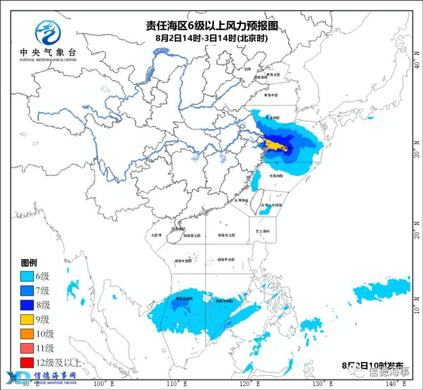 大风预报:8月2日14时至8月3日14时,东海大部、黄海西南部将有6-7级大风,东海北部部分海域、舟山群岛、杭州湾、上海沿海、长江口区、江苏东南部沿海将有8-9级大风,“云雀”中心经过东海北部部分海面风力可达10级,阵风11级。