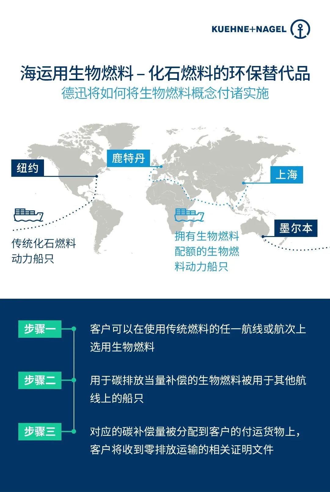 相较于资源可能耗尽并释放额外二氧化碳排放的化石燃料,新一代生物燃料仅由可再生原料生产,并且具有循环碳生命周期,从而实现废弃物或生物质的再利用。与传统化石燃料相比,生物燃料在生产过程中的排放和低能量密度已经获得超出排放量的碳补偿,因此利用生物燃料,德迅可保证其客户在海运物流中100%避免产生温室气体(CO2e)的排放。