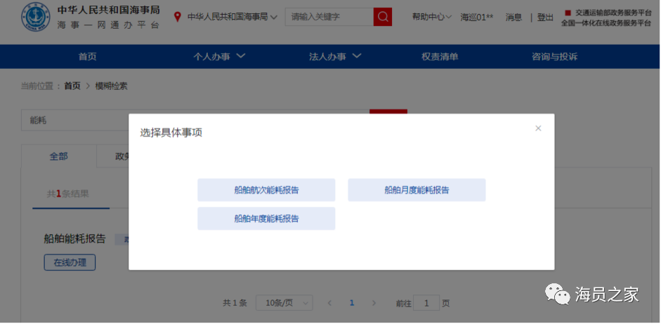 第一步,打开海事一网通办平台首页https://zwfw.msa.gov.cn/,点击右上角【登陆】跳转至登陆界面,输入账号密码登陆海事一网通办平台,在首页上方通过关键词搜索“能耗”,点击右侧红色搜索键找到船舶能耗申报界面。