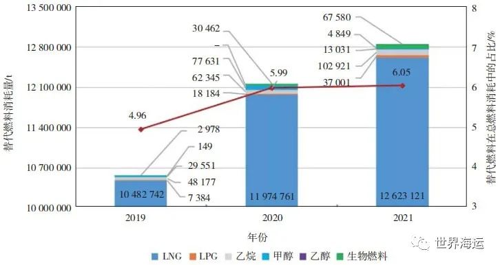 图7 基于IMO船舶燃油消耗数据库的2019—2021年替代燃料消耗情况