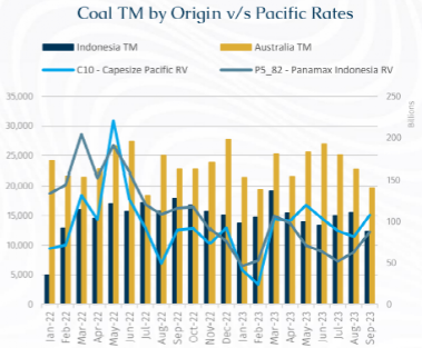Panamax型船在印尼装载煤炭的船舶中占很大比例,9月份波罗的海运价指数(P5)平均为12256美元/天,高于1月份的7732美元/天,但比去年低了24.6%。今年到目前为止,该指数平均为10040美元/天,也要低于2022年的平均18939美元/天。