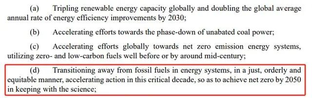 而在最终协议中,使用了“转型脱离化石燃料”(Transitioning away from fossil fuels)这一表述。虽然删除了“逐步淘汰”(phase out)这种更严格的目标,但此次达成的“阿联酋共识”依然被称为是一个“历史性协议”。