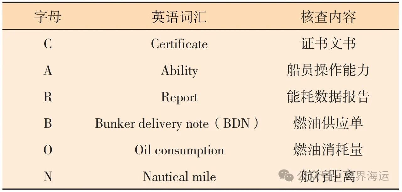 在上海海事局船舶能效管理中心的指导下,根据国际公约和国内法规的要求,通过梳理能效现场监管中发现的各类常见问题,宝山海事局总结出一套可操作性强、有针对性的能效数据核查方法——“CARBON”要点核查法。“CARBON”是“碳”,与行业脱碳的主题契合。这套核查法基本覆盖了能效相关的重点要素,在开展现场监管时具有全面覆盖、重点突出的特点,能更好地保证核查效果。“CARBON”要点核查法中每个字母都是其中一个核查要点英文单词的首字母,见表1。
