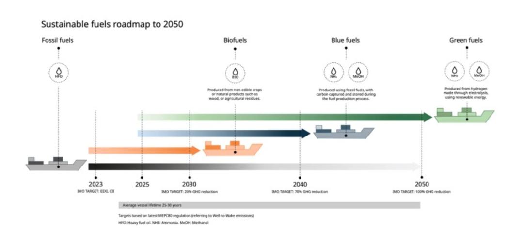 为了实现国际海事组织到2050年实现温室气体净零排放的目标,航运业需要持续提升船舶效率并减少排放。最终目标是过渡到零排放绿色燃料,但实现这一转变需要在化石燃料和更清洁的替代燃料之间建立“桥梁”。过渡燃料是开始过渡并延长船舶寿命的明智方法,而零排放替代燃料的生产仍在扩大。