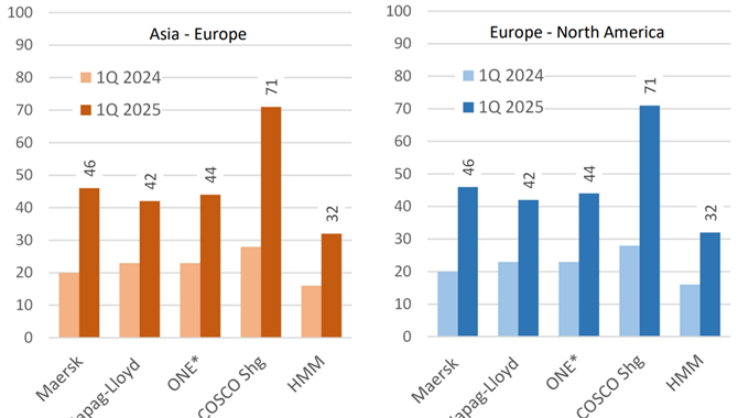 2025年一季度 Vs 2024年一季度排放附加费(欧元/TEU), Alphaliner