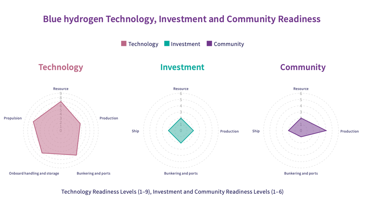 针对氢能源的可行性准备水平,海事脱碳中心(Maritime Decarbonisation Hub)以技术、投资、社区三个维度进行全面分析,分别对应: