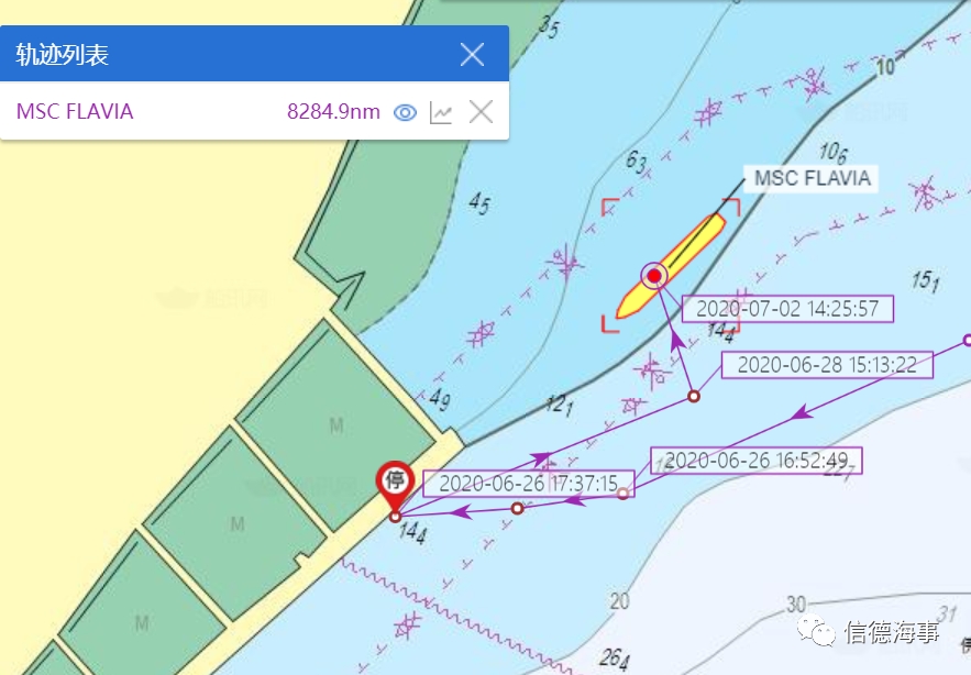 根据船讯网为信德海事网提供的MSC Flavia轮港口挂靠信息以及船位轨迹显示,该轮于6月26日挂靠宁波港,随后于28日被拉开码头,目前该轮应该仍在港区内。